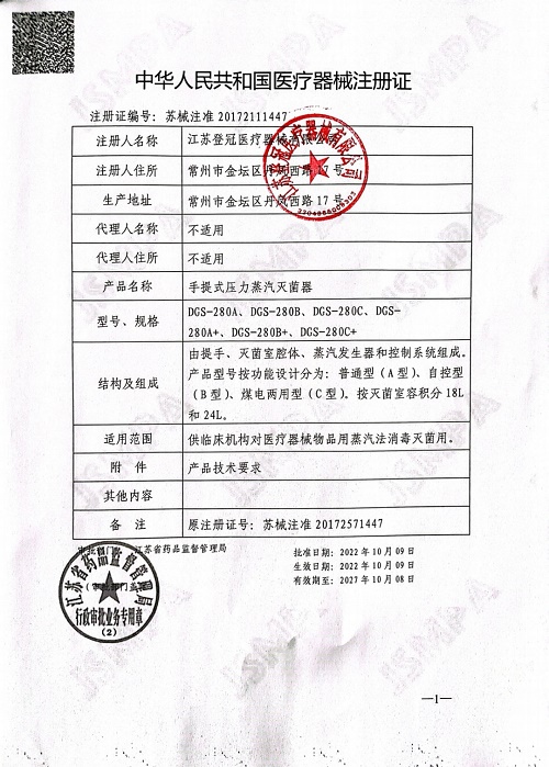 產(chǎn)品名稱 : 登冠手提式壓力蒸汽滅菌器DGS-280B